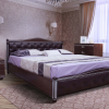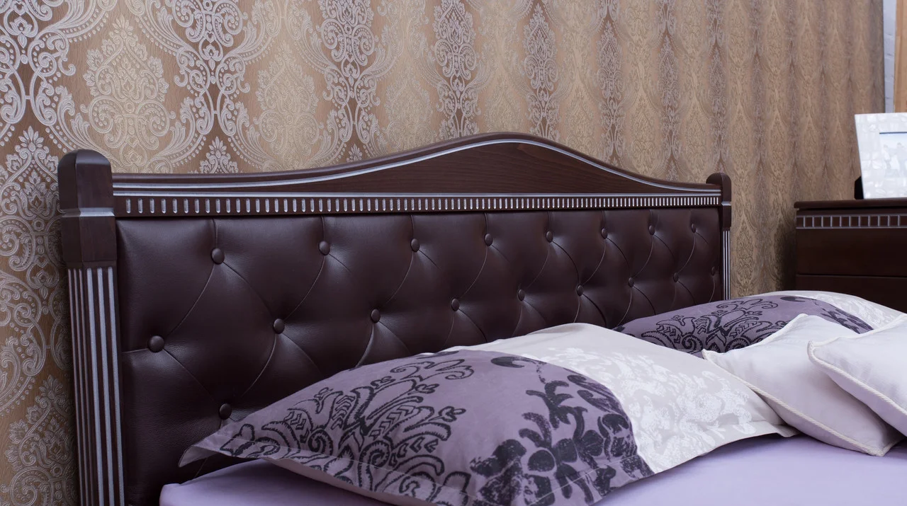 Двуспальная кровать из массива бука, укомплектована ортопедическим ламельным блоком, изголовье обито кожзамом темного цвета, декорировано “каретной стяжкой”.