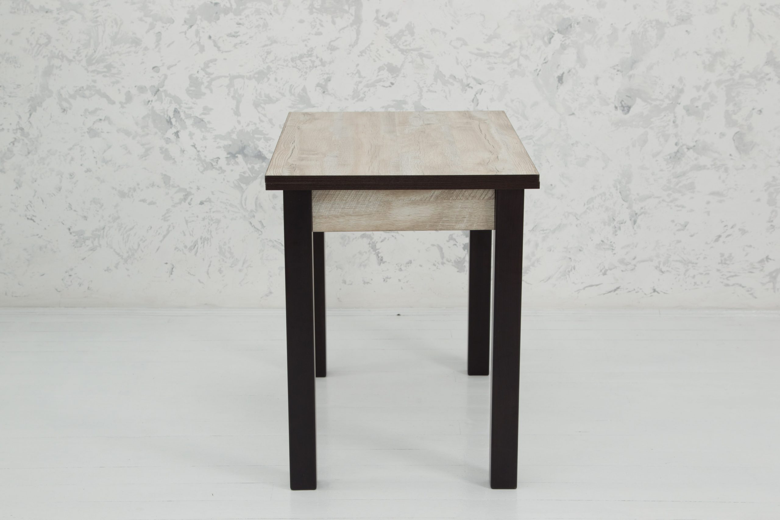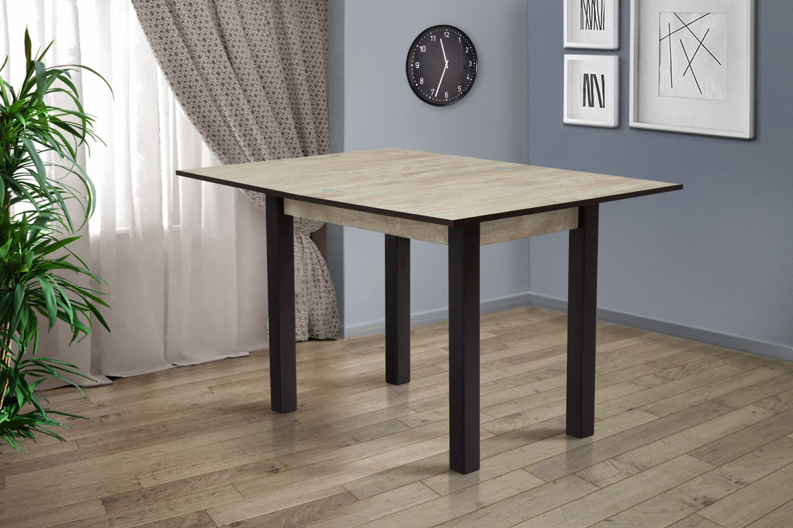 Стол трансформер Скай от известного в Украине поставщика мебели будет наиболее удачной и функциональной моделью в малогабаритных кухнях. Ведь он легко увеличивается в размерах. В сложенном состоянии длина столешницы составляет 90 сантиметр и вполне подойдет для размещения семьи из четверых человек. Но как только к вам зашли в гости друзья, изделие приобретает длину 120 сантиметров.